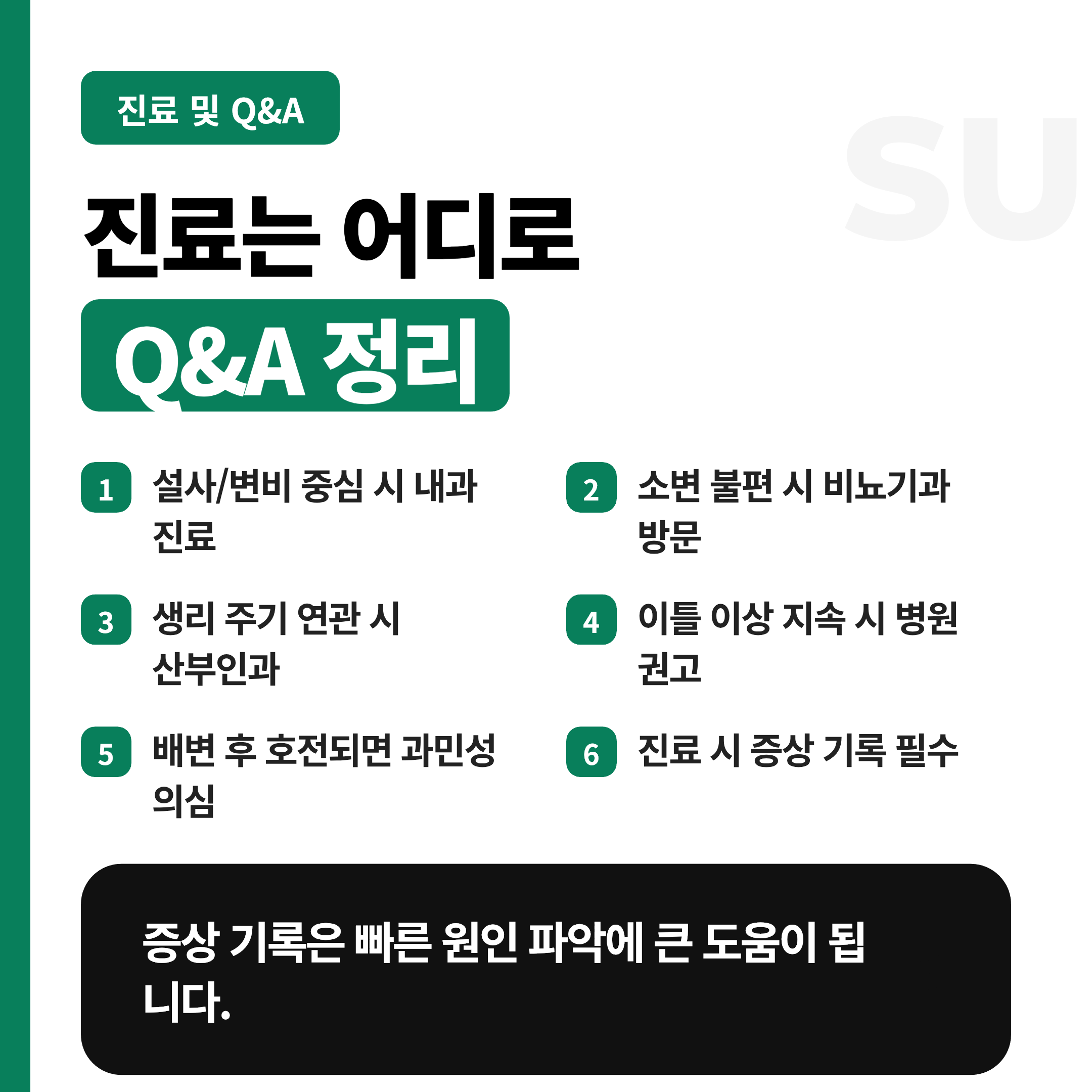 - 설사나 변비, 복부팽만이 중심이면 내과 또는 소화기 진료